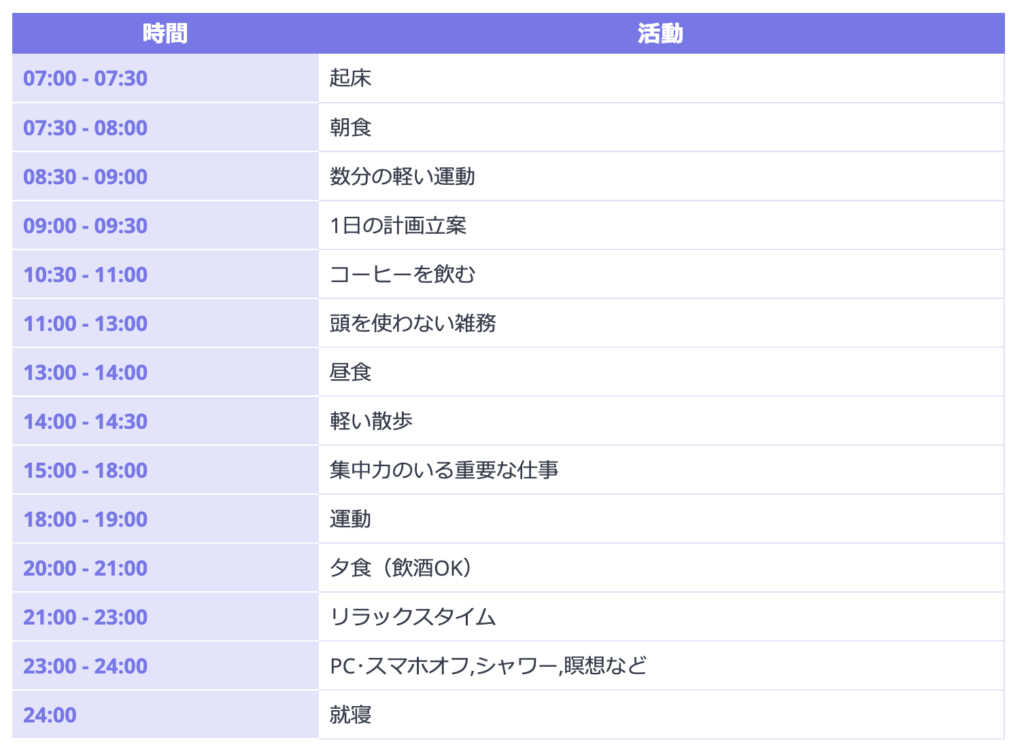 クロノタイプ診断を受けると、理想の1日のスケジュールを出してくれるので、このスケジュールをもとに自分の生活に合わせて微調整していきます。